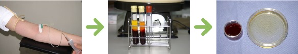 ②遠心分離機にかけて、濃縮した血小板の溶液をつくります。